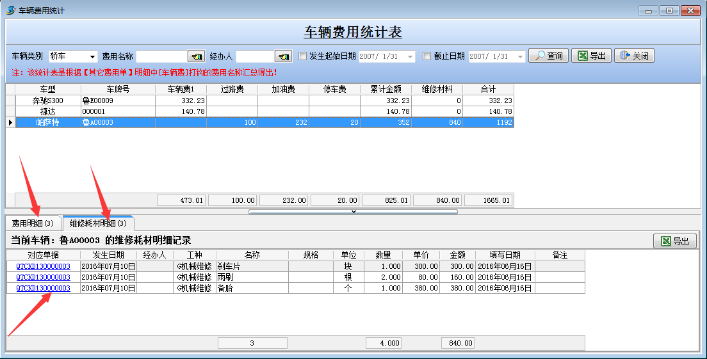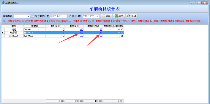 注:當前查詢的時間段必須有【其他費用單】明細發生過[車輛]及[加油費]業務信息,且[本期加油量]是根據“數量”欄目合計得出,本期加油量(L/100KM)=本期加油量/[(期末里程—期初里程)/100]