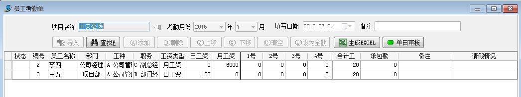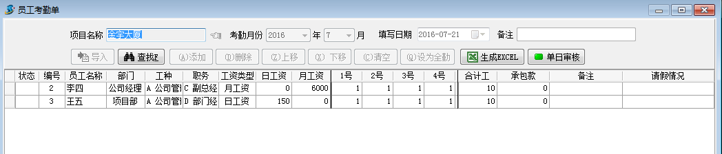 3. 在工程項(xiàng)目管理系統(tǒng)建立員工考勤單。我們以李四和王五在金宇大廈項(xiàng)目分別出勤10天,在中央豪庭項(xiàng)目分別出勤20天為例,建立考勤單為例。如下圖: