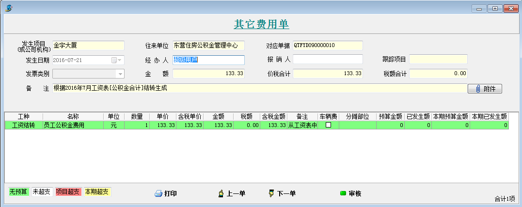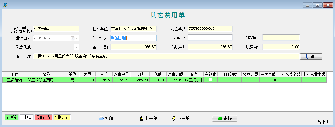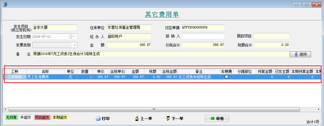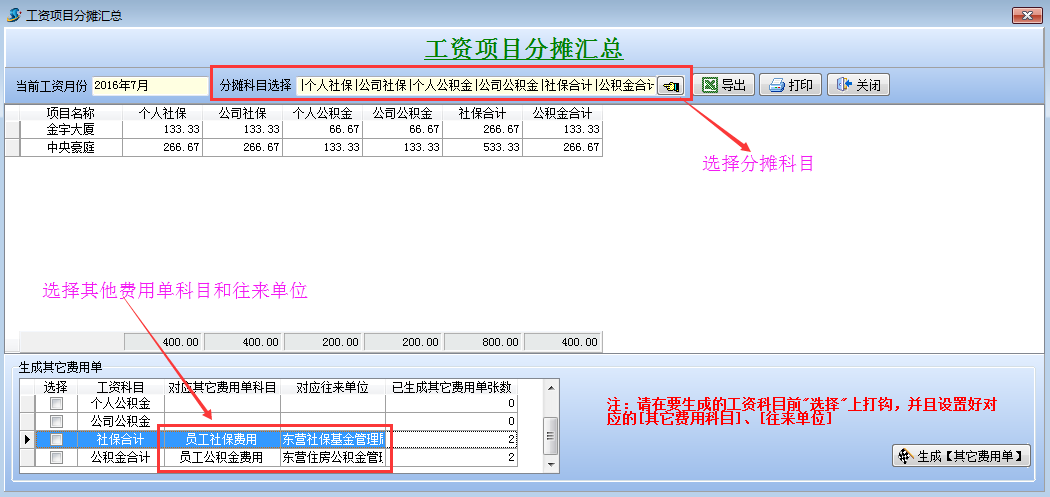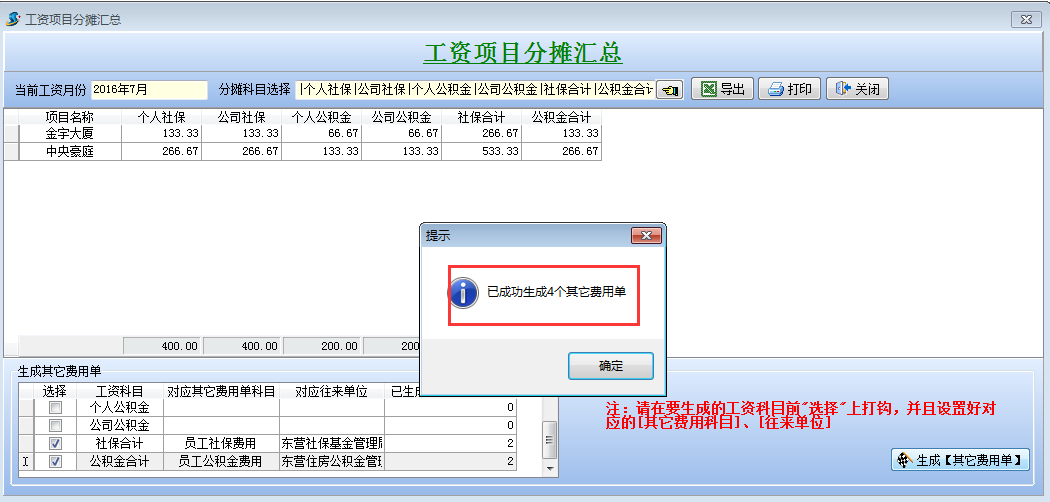 打開待攤費(fèi)用模塊,選擇好分?jǐn)偪颇浚斜碇芯蜁?huì)顯示出每個(gè)項(xiàng)目分?jǐn)偪蛻舻拿骷?xì)。同時(shí)在這個(gè)模塊可以直接生成其它費(fèi)用單,選擇好社保合計(jì)和公積金合計(jì)的對(duì)應(yīng)其它費(fèi)用單科目和對(duì)應(yīng)往來單位,點(diǎn)擊生成工程項(xiàng)目管理系統(tǒng)【其它費(fèi)用單】,直接可以生成四張其他費(fèi)用單。