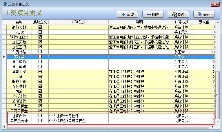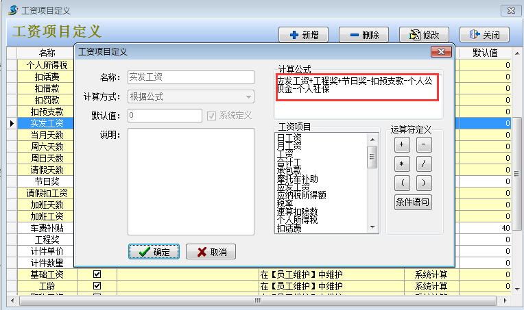 2. 然后在工程項(xiàng)目管理系統(tǒng)【員工管理】-【工資項(xiàng)目定義】設(shè)定好實(shí)發(fā)工資的公式和新增社保合計(jì),公積金合計(jì)兩個(gè)工資科目。其中實(shí)發(fā)工資公式中要減去個(gè)人社保和個(gè)人公積金。如下圖:
