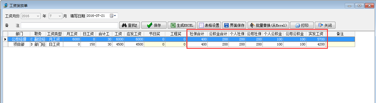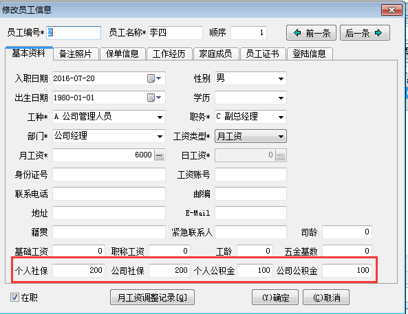 1. 首先在工程項(xiàng)目管理系統(tǒng)員工維護(hù)填寫好個(gè)人社保,公司社保,個(gè)人公積金,公司公積金相應(yīng)的金額。如下圖: