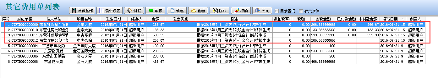 回到【財(cái)務(wù)管理】其它費(fèi)用單列表,就會(huì)看到這四張其它費(fèi)用單。