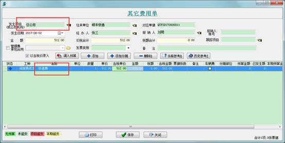 發生的項目我們選擇總公司,費用名稱為快遞費(可以事先在費用科目維護里設置好)。