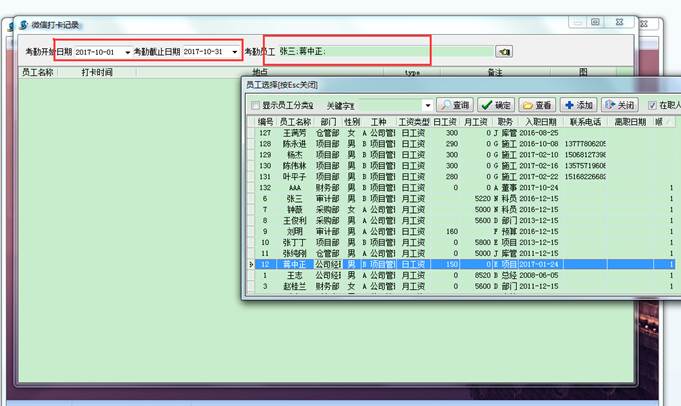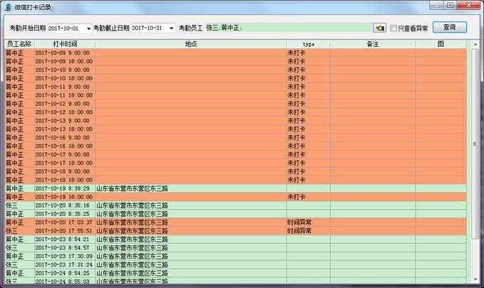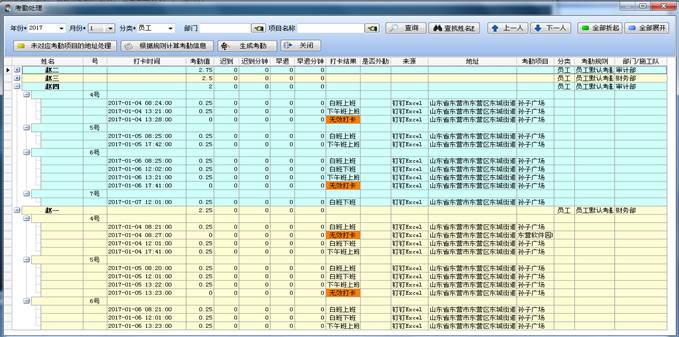 選擇好時間段,和考勤員工后,點擊查詢按鈕,出現如下圖所示
