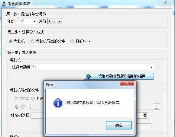 選擇好對應公司或者項目的考勤機,點擊讀取考勤機最新數據到數據庫。操作完成會提示成功讀取了多少條數據,并寫入到數據庫。如下圖: