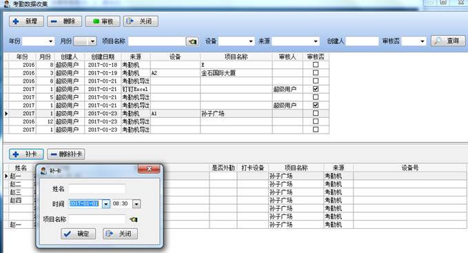 在考勤機設備或者釘釘上讀取考勤信息完成之后,如果有漏打卡需要補卡的,就可以點擊補卡,選擇好姓名、時間、項目名稱即可。