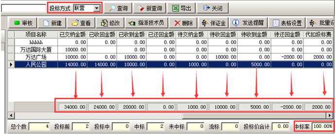 在工程管理軟件項目開拓列表中可以查詢多個項目投標保證金的九項合計,如圖所示:也可根據投標方式、業務員、項目狀態查詢。
