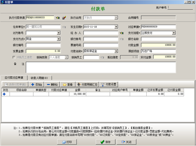 交納投標保證金時填寫“付款申請單”或者“付款單”,(如果填寫的是付款申請單則在付款申請單審核通過之后進行付款),如圖: