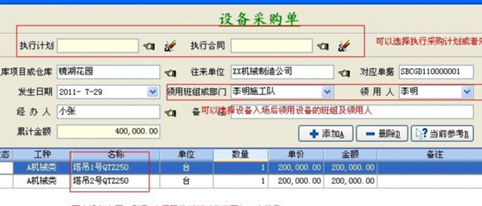 在使用機(jī)械設(shè)備的過程由于老化、意外事故等情況,需要重新采購設(shè)備。那么可以執(zhí)行設(shè)備采購合同,設(shè)備的基礎(chǔ)信息可以直接從合同中導(dǎo)入。