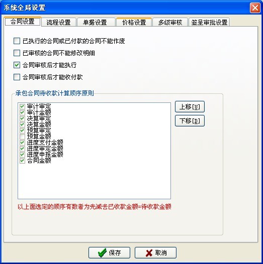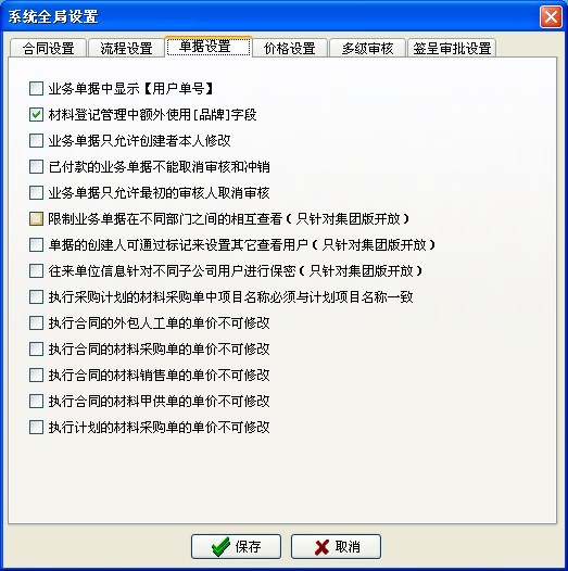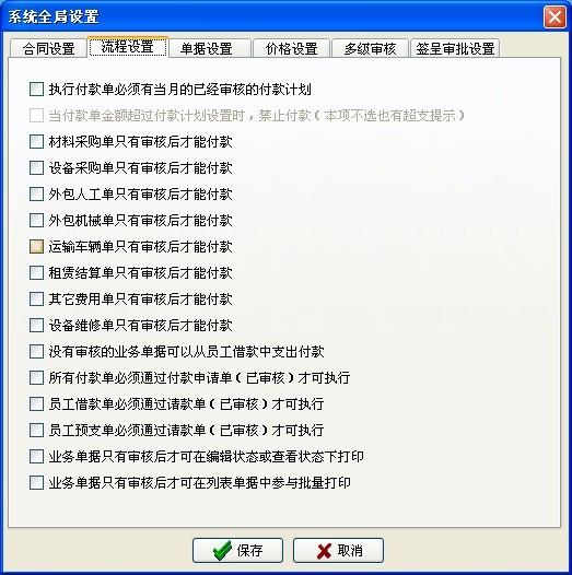 四、進行【全局設置】,用戶要根據(jù)自己公司的實際情況進行設置,多余的控制流程要去除,需要的要打鉤。如下圖: