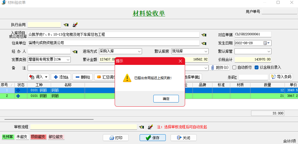為了控制單據延遲上報時間,金石工程項目管理軟件專門開發了機械日報單、材料采購單、外包機械單、其它費用單、外包人工單、采購變更單、分包變更單、租賃變更單、其它變更單、銷售變更單等單據延遲上報天數設置。也就是企業可以自定義單據延遲上報天數,單據發生日期超出上報天數時不允許保存。