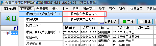 1、項目收集參數自定義:菜單欄 “工程管理模塊”→“項目收集參數自定義”