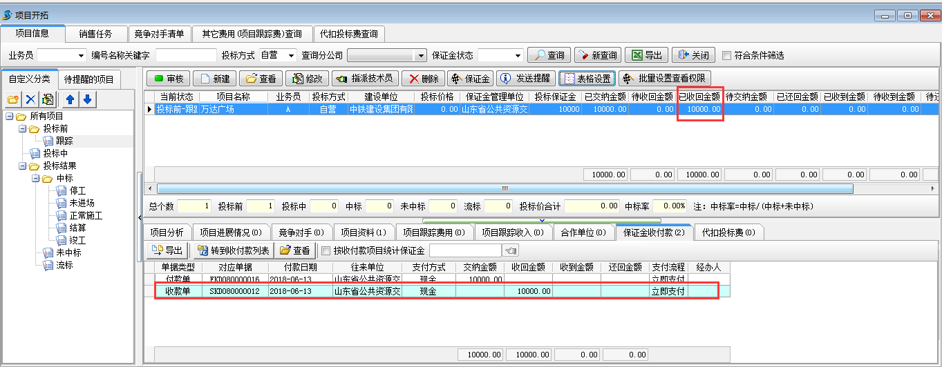 保證金收回,工程管理軟件的項目開拓中會顯示“已收回金額”為收款金額,待收回金額會減去已收回金額,“保證金”收付款中會有對應的收款記錄,如圖: