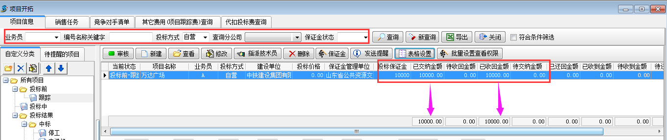 在工程管理軟件項目開拓列表中可以查詢多個項目投標保證金的九項合計,如圖所示:也可根據投標方式、業務員、項目狀態查詢。