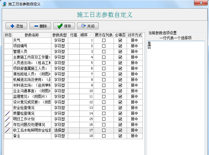 ①點“添加”按鍵增加豎列; ②在“參數名稱”列輸入需要的內容; ③“參數類型”列選擇類型,其中“字符型”可輸入文字和數值、 “選擇型”可以如下圖中顯示一行代表一個選擇項,只可選擇不能輸入 、“數值型”只能輸入數值,不能輸入文字內容 、 “布爾型”則是勾選選擇型; ④“順序”列調整自定義項的先后排序 。