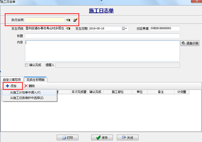 2、點“添加”可以從“施工計劃單”或“施工任務維護”中調入并填報完成量