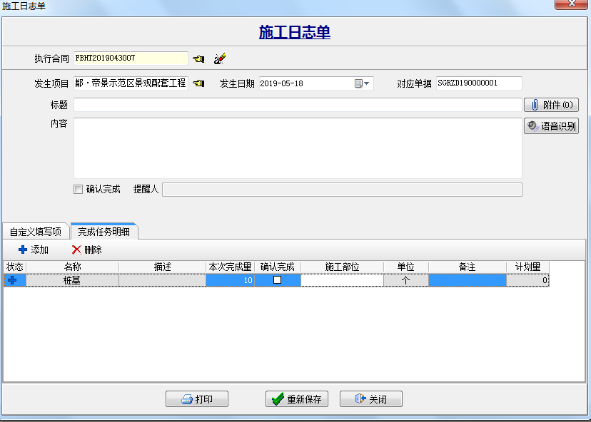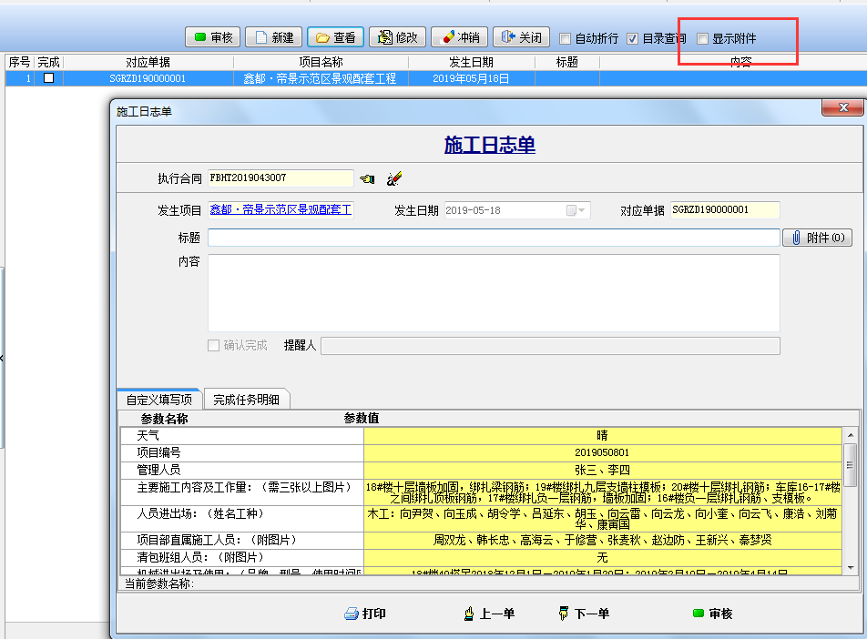 三、填報“施工日志單”根據自定義的字段 輸入相對應的內容,點下圖中的“顯示附件”添加施工現場的圖片。