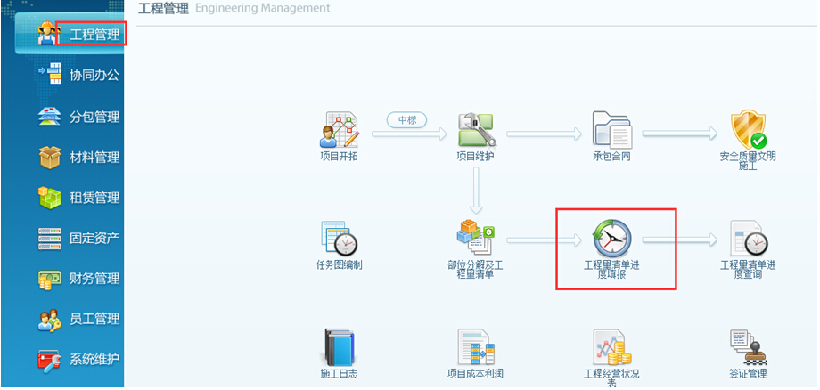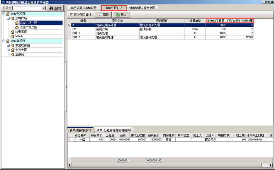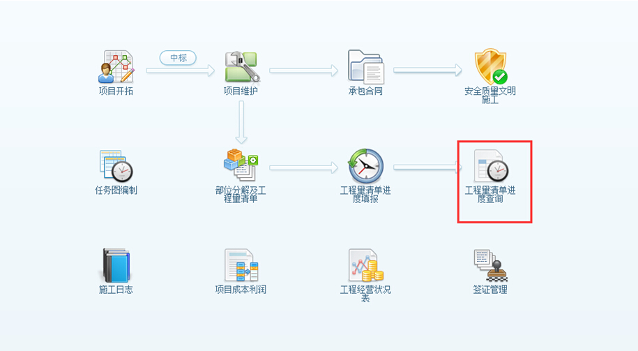 項目進度查詢時,系統會根據項目部分以及工程量清單匯總項目進度。如圖: