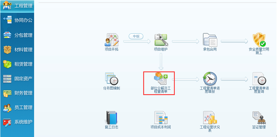 在《金石工程項目管理軟件》中,進入導航【工程管理】->【部位分解及工程量清單設置】進行分解操作,如下圖: