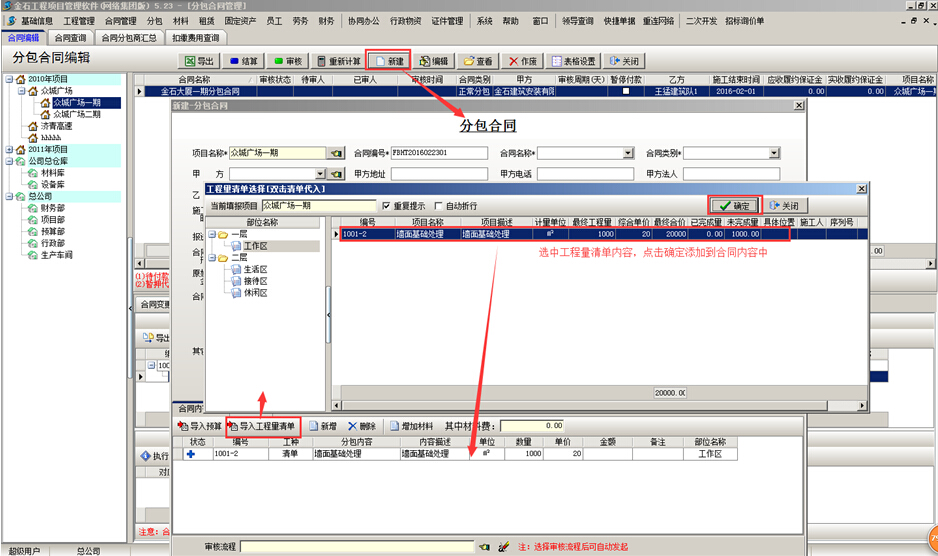 (2)分包的工程通過【分包管理】中做【分包驗收單】來實現。正常的分包驗收要有分包合同。在做分包合同時可引用部位分解里的清單,如下圖: