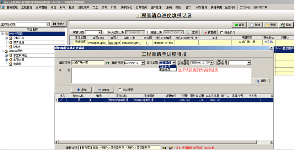 項目進度填報方式分為:形象進度填報(上報給甲方的進度)和實際進度填報,兩者的上報量可以不一樣,形象進度填報主要是和甲方結算使用,該填報會體現的【承包合同】應收款中。實際進度填報主要是體現實際完成量,該填報得出的實際產值會體現到【項目成本利潤表】、【工程經營狀況表】和成本發生成本進行比較。注:在當今社會為提高企業收益,工程實際施工量(即分包合同簽訂量)會小于向甲方上報的形象進度量,該情況主要與現場項目經理水平有很大關系!