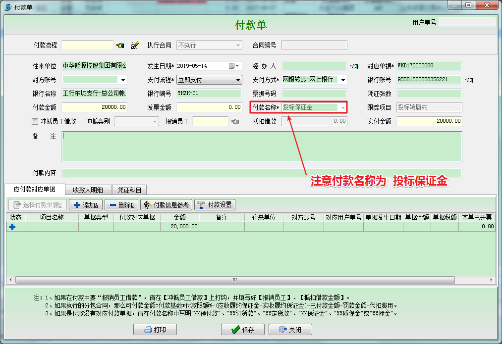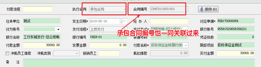 選擇對(duì)應(yīng)合同后,我們?cè)偃ゲ榭丛稑?biāo)保證金的付款單時(shí),會(huì)發(fā)現(xiàn),該付款單已經(jīng)與新建的承包合同關(guān)聯(lián)起來。