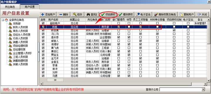 然后陳勝的項(xiàng)目授權(quán),登錄超級用戶----系統(tǒng)維護(hù)----打開用戶管理權(quán)限設(shè)置,選中陳勝,設(shè)置項(xiàng)目授權(quán)