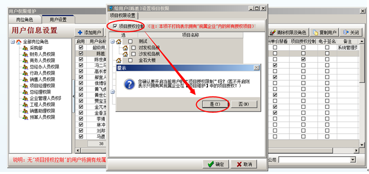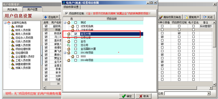 彈出設(shè)置項(xiàng)目授權(quán),以陳勝只有金石大樓這個項(xiàng)目的權(quán)限進(jìn)行項(xiàng)目授權(quán)