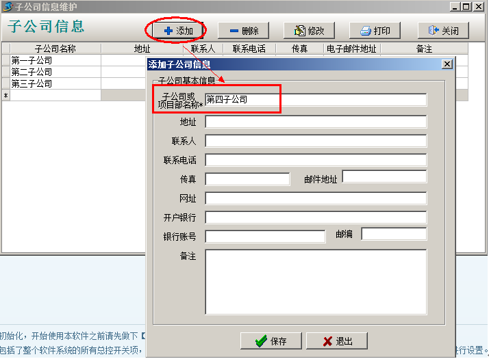 金石工程管理軟件中首先維護(hù)子公司名稱,打開菜單欄----系統(tǒng)----子公司信息維護(hù)