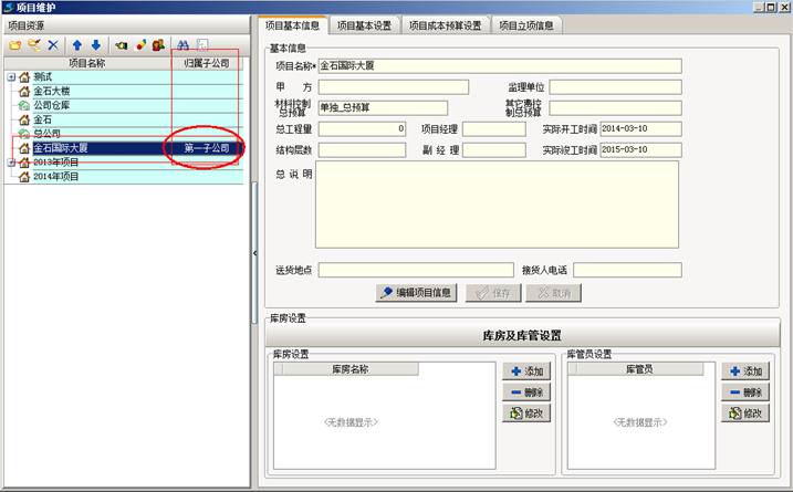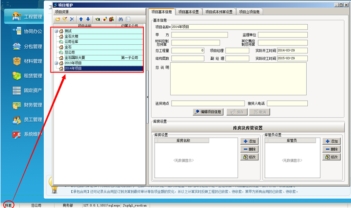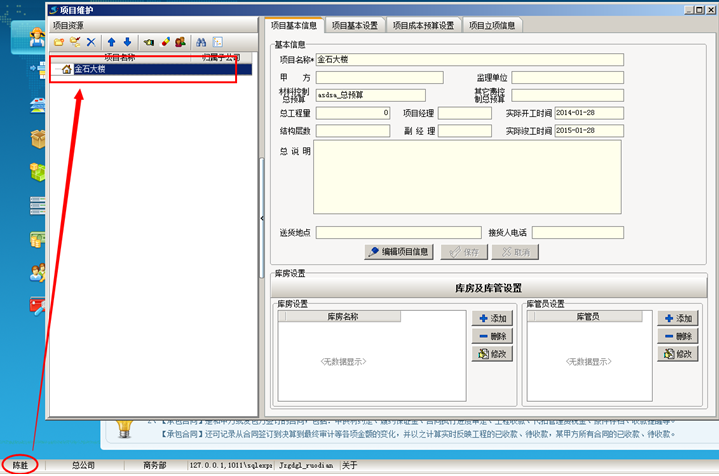 工程管理軟件中設(shè)置完成之后,重新登錄陳勝的賬戶,查看該員工的項(xiàng)目權(quán)限,項(xiàng)目維護(hù)中顯示的項(xiàng)目只有金石大樓這個項(xiàng)目
