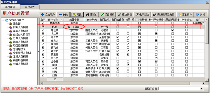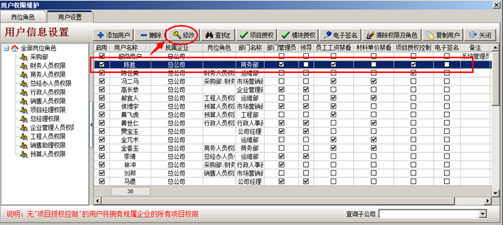3.工程管理軟件中設(shè)置子公司員工:以員工陳勝為例講解,登錄超級用戶----系統(tǒng)維護(hù)----用戶管理權(quán)限設(shè)置。選中員工陳勝,點(diǎn)修改按鈕