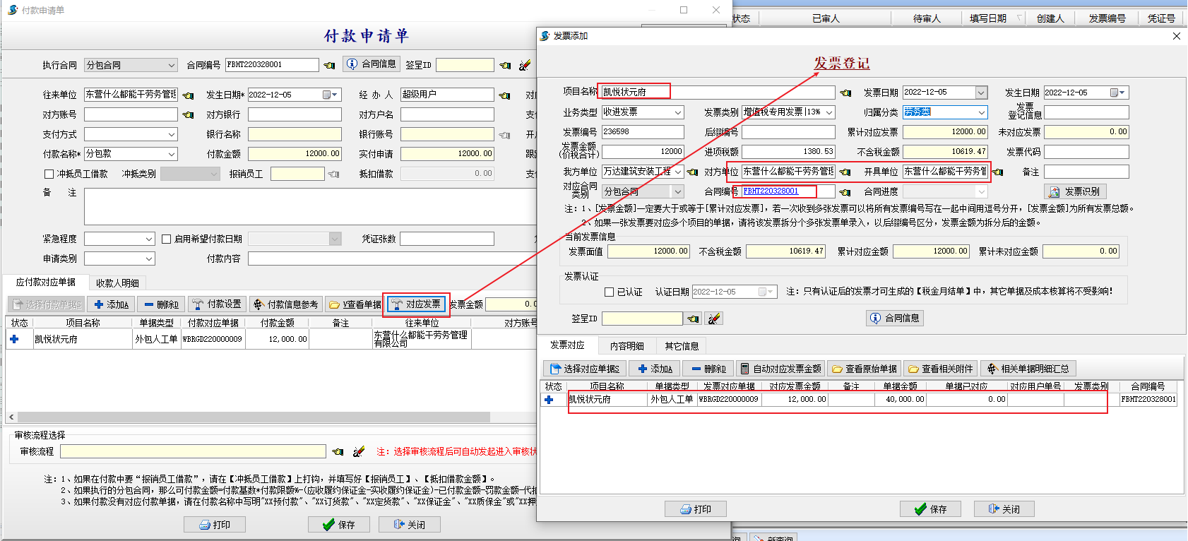 金石工程管理軟件新增付款申請單界面可直接做發票登記