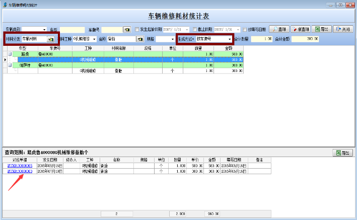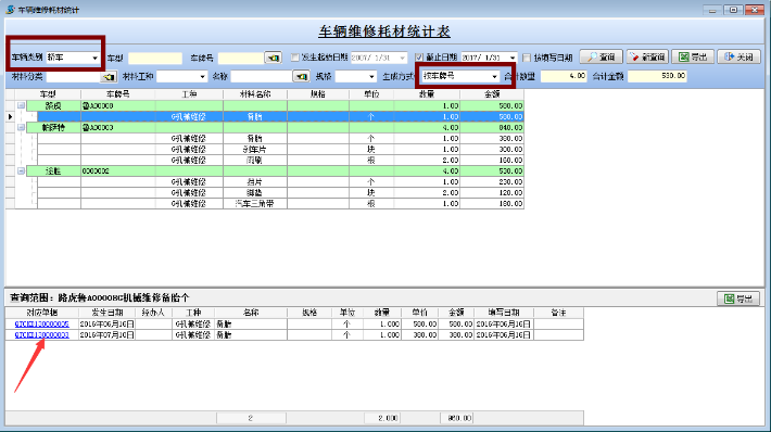 【材料管理】→【其它出庫(kù)單】,出庫(kù)類別→車輛維修→車牌號(hào)