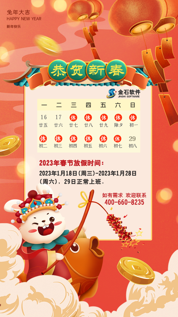 金石軟件茲定于2023年1月18日開始新春假期,1月29日日恢復(fù)營業(yè),假期雖至,如您有需求仍可以撥打400-660-8235或您所知曉的軟件工程師電話獲取服務(wù)。