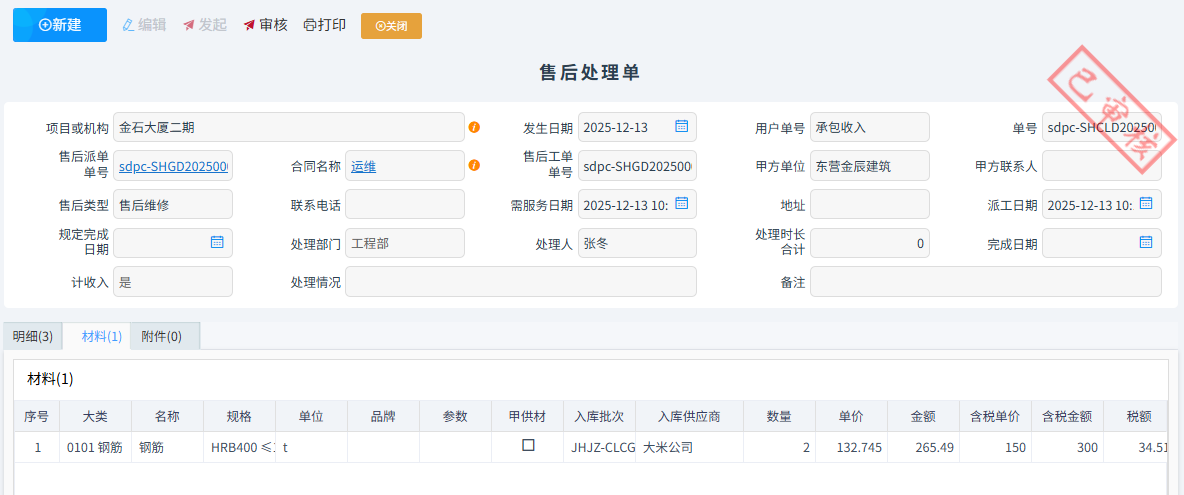 現場技術人員維修或者安裝完成之后填寫售后處理單。售后處理單可以關聯售后派單,自動生成需處理明細。