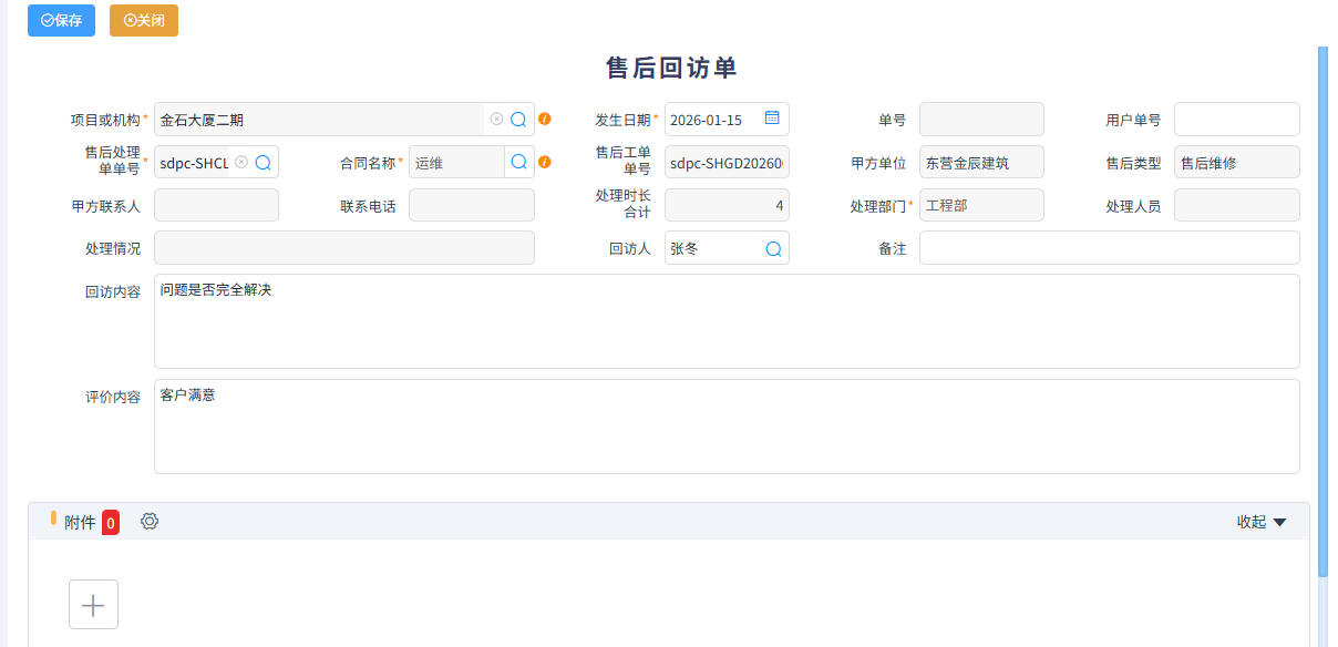 在售后派單中可以關聯工程收入合同和其它收入合同,做為后期工程結算和其它收入結算的依據。