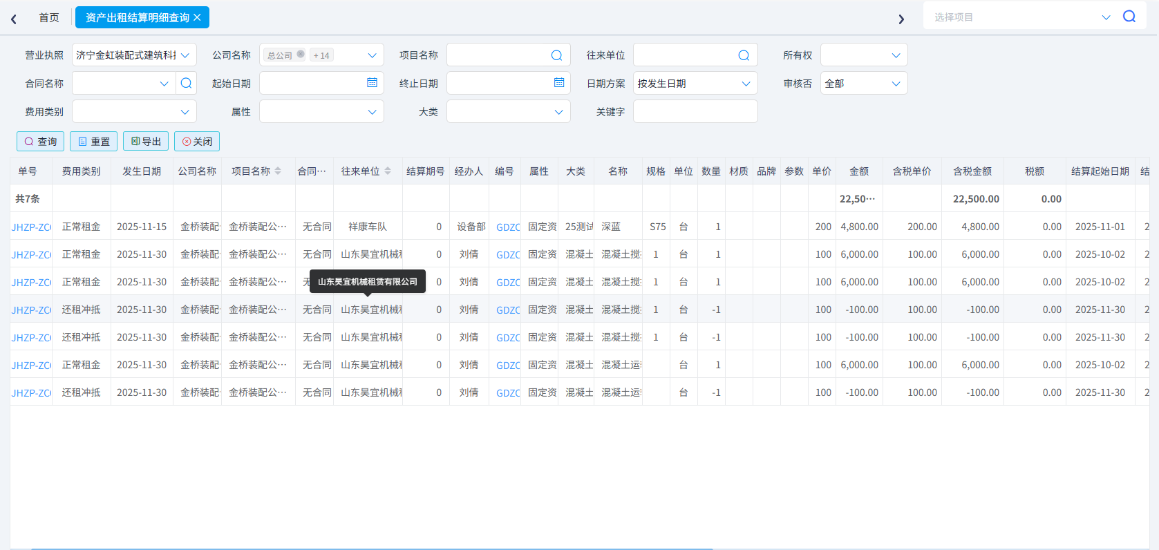 (7)資產(chǎn)出租結(jié)算明細查詢