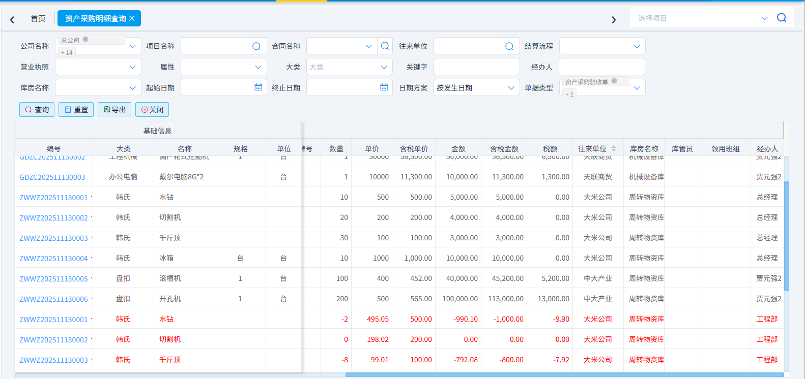 (4)資產(chǎn)采購明細查詢(紅色字體為資產(chǎn)退貨)