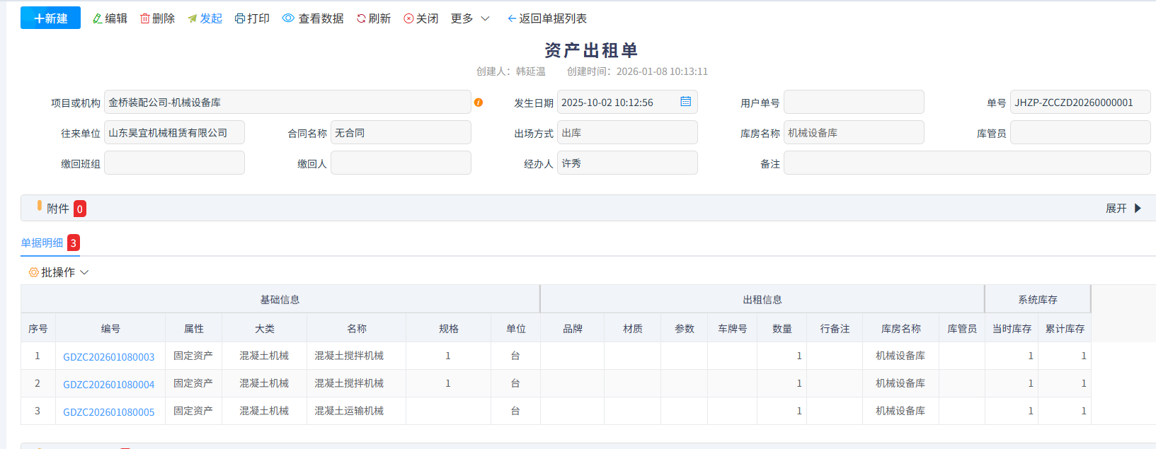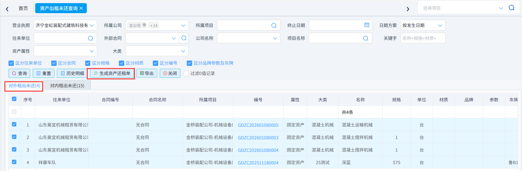 系統(tǒng)對內(nèi)出租與對外出租分開展示一目了然且支持在查詢內(nèi)快捷生成資產(chǎn)還租單