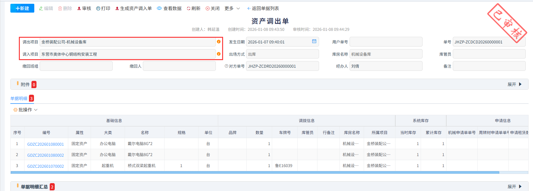 資產(chǎn)調(diào)入是指企業(yè)將資產(chǎn)從其他項目、部門或倉庫轉(zhuǎn)入特定使用地點的流程,資產(chǎn)調(diào)入單須通過已審核的資產(chǎn)調(diào)出單生成,生成過程中調(diào)入方可根據(jù)實際情況選擇入庫和即入即出(此選項不進入庫房,領(lǐng)用無需出庫)