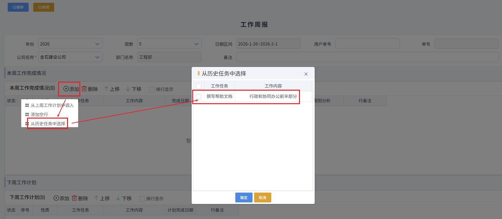 年份默認(rèn)為本年度,周數(shù)會(huì)顯示本年度所有周數(shù),如26年會(huì)顯示1~52周,公司名稱需要手動(dòng)選擇。注意上圖中的工作周報(bào)若本周的工作任務(wù)沒(méi)有完成,那么新的一周的工作周報(bào),可以直接調(diào)取未完成的歷史任務(wù)。如下圖所示:
