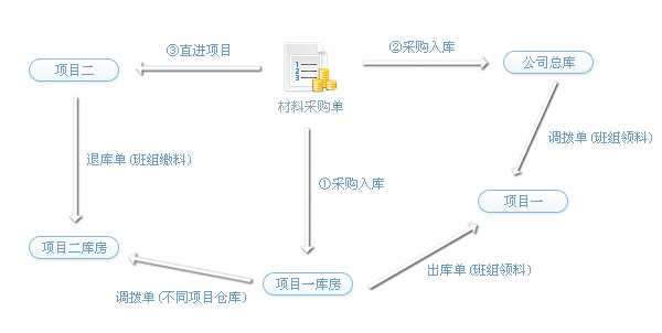 注:材料入場方式一般分為三種:1.材料入項目庫房、2.材料入公司總庫、3.材料直進項目 如下圖:
