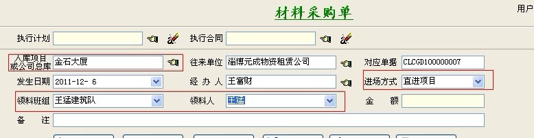 軟件的操作流程:新建【采購計劃單】->相關審核人員打開【采購計劃單列表】-【審核】->(最終審核通過)->新建【采購合同】并填寫合同內容 ->執行采購合同(即新建【材料采購單】-執行計劃單),(進場方式:采購入庫)。