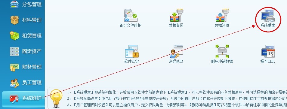 系統重建一般是在軟件正式使用前,清除以前測試數據庫時使用。