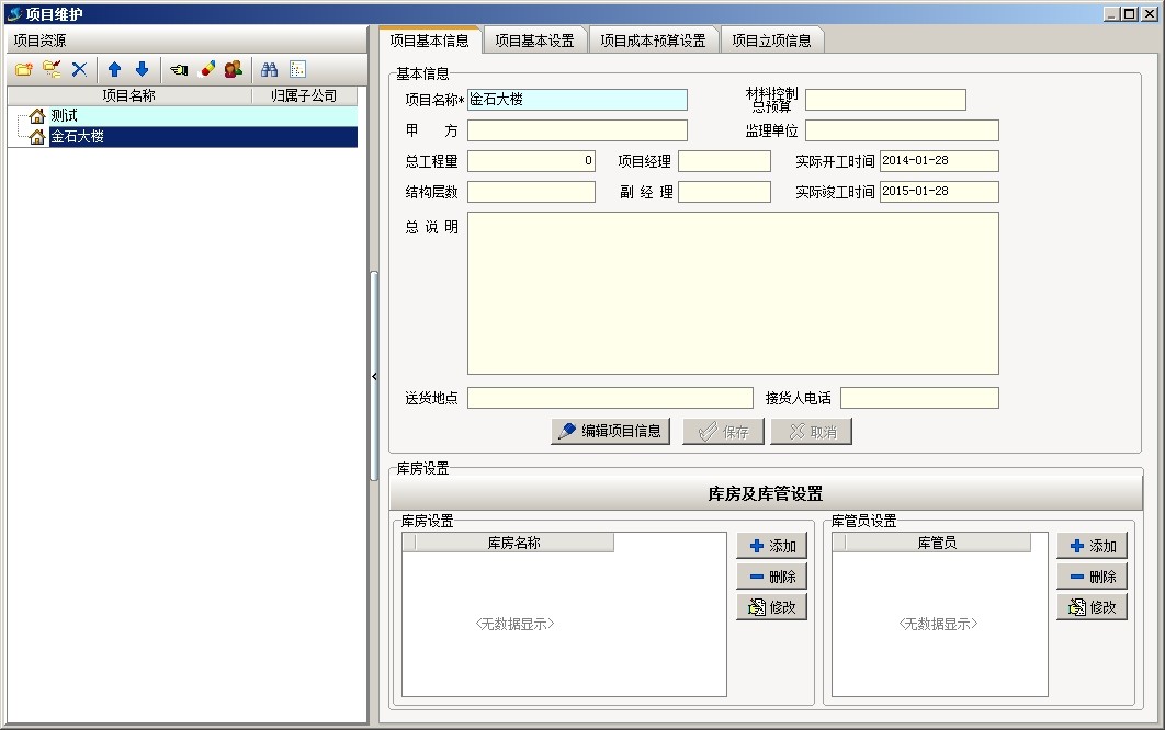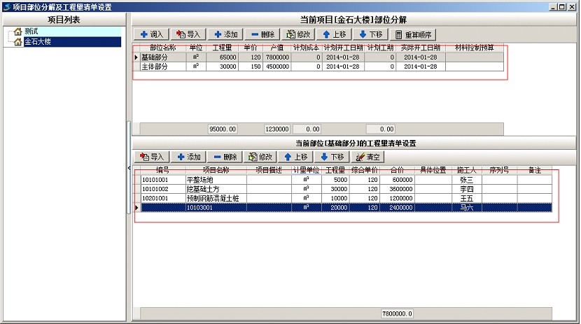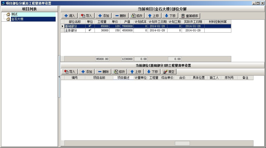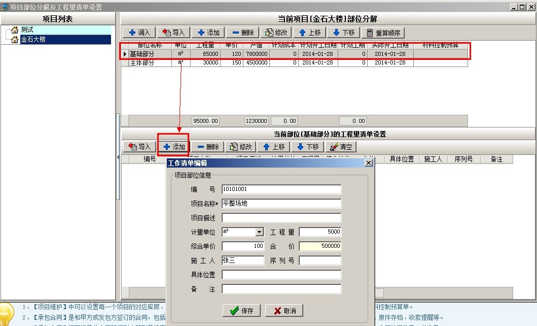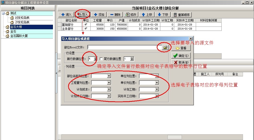 上圖是工地常用部位劃分的部分清單內(nèi)容,下面以上面截圖為例說明軟件中工程的部位劃分,首先新建項(xiàng)目金石大樓