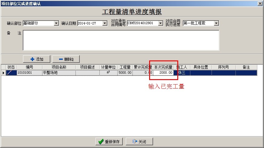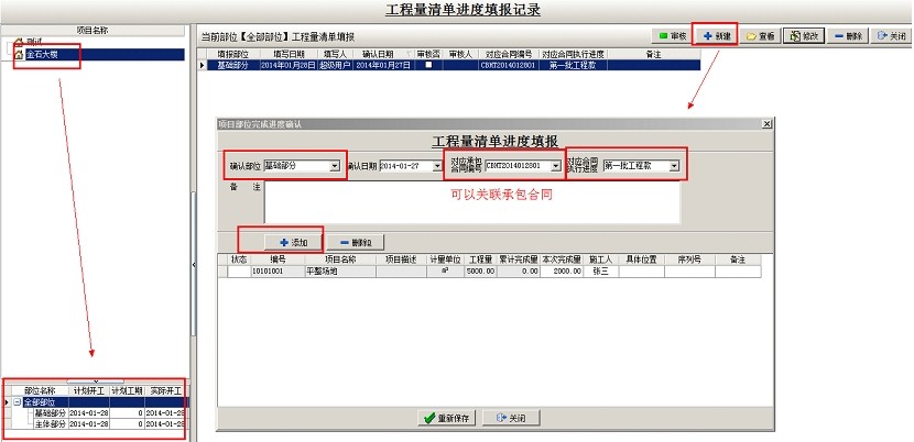 選中相應(yīng)的項(xiàng)目,點(diǎn)擊新建,填出工程量進(jìn)度填報(bào)窗口,選擇部位名稱,可以選擇關(guān)聯(lián)項(xiàng)目對應(yīng)的承包合同號和承包合同執(zhí)行進(jìn)度,然后點(diǎn)添加,調(diào)入清單內(nèi)容,在本次完成量處輸入已完成的工作量,不限制錄入進(jìn)度填報(bào),直至清單工作量完成,調(diào)入下一項(xiàng)清單內(nèi)容(如某項(xiàng)清單實(shí)際工程量超過清單預(yù)算量,可以繼續(xù)填報(bào))