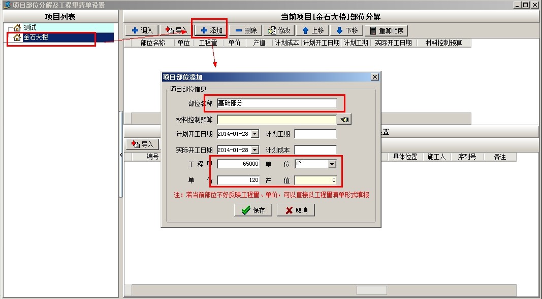 選中項(xiàng)目,點(diǎn)當(dāng)前項(xiàng)目部位分解的添加,彈出添加窗口,填寫部位名稱、工程量、單位等相關(guān)信息,多個(gè)部位需要多次添加。也可以使用簡單方法,做好EXCEL電子表格,導(dǎo)入