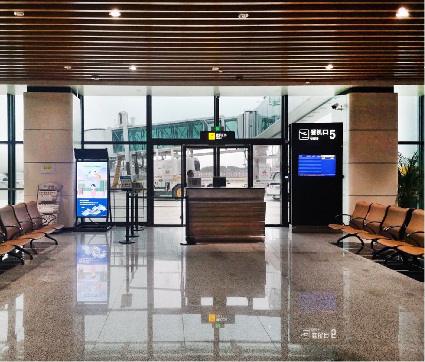 LED液晶在旅客登機口通道旁,候機廳人流密集。
