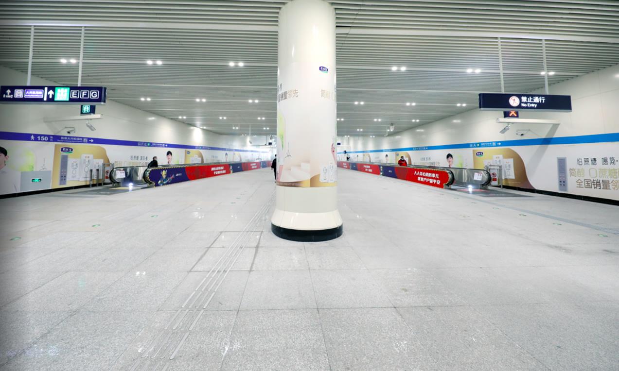 位于換乘通道入口 ,弧形墻面正對(duì)地鐵站廳,雙側(cè)超大墻貼直面乘客,利于產(chǎn)生直觀品牌印象,提升品牌認(rèn)知度