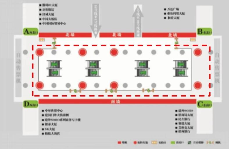 2、站廳西北側(cè)A出口:中國(guó)大飯店、中國(guó)國(guó)際貿(mào)易中心、國(guó)貿(mào)商城、國(guó)貿(mào)飯店、國(guó)貿(mào)公寓、中海廣場(chǎng)寫(xiě)字樓